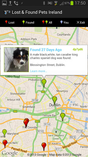 Each listing on the map is represented by a marker just as on the maps on our website, red ones for lost listings, green for found and also, just as on the site, tapping on any marker will reveal a summary of that listing along with a photo of the pet if available.