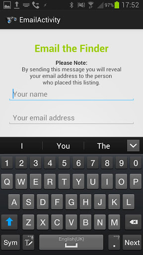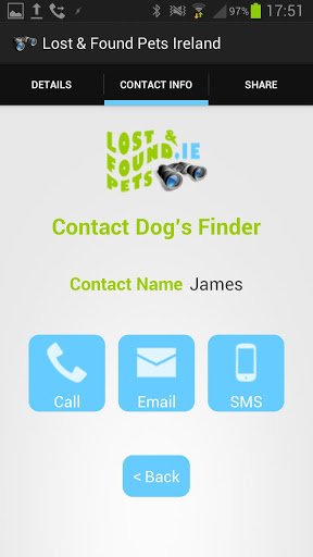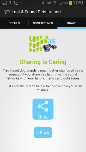 Finaly, the app features facilities to send us feedback via another simple form and to share the app with others - obviously, the more phones we are on, the more chance we have of getting pets reunited.
