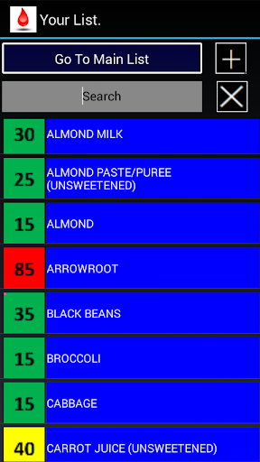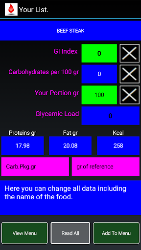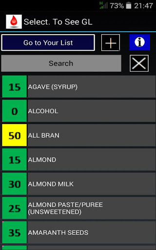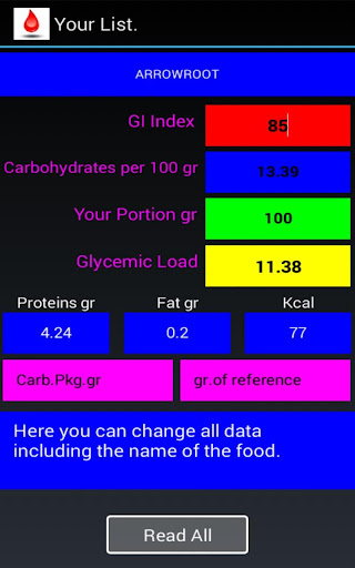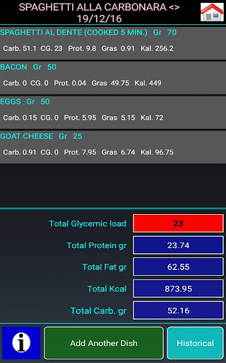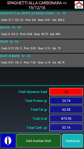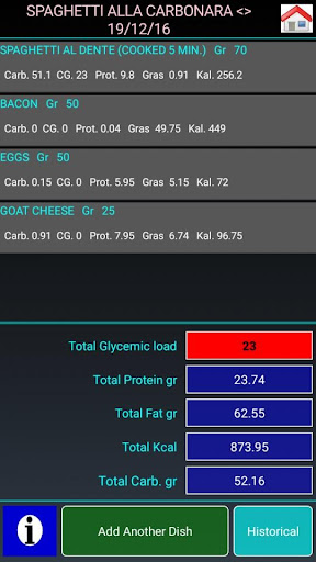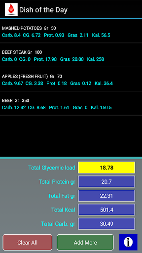 From your list you can add to the dish of the day. And see the total values (GL, Carbohydrates, kcal, Proteins, Fats).