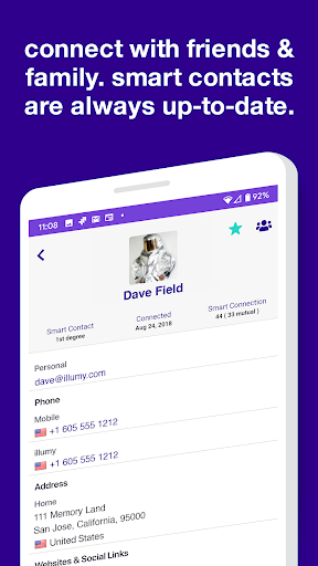 SMART CONTACTS: Next-gen contact management allows you to import your contacts into illumy and transform those basic contacts into smart contacts that are always up to date. No more wondering if you have the right number or email for your contacts. You can also connect with others, sync contacts, and share your profile with them—and you can decide who can see which piece of your contact info.