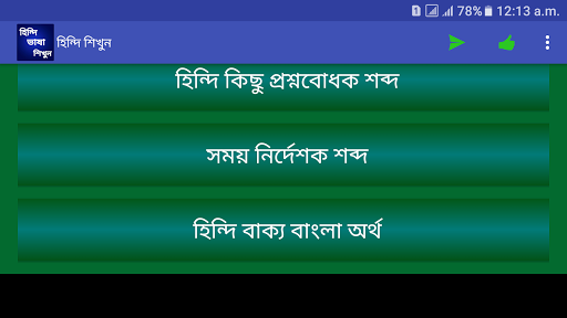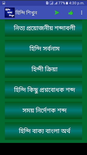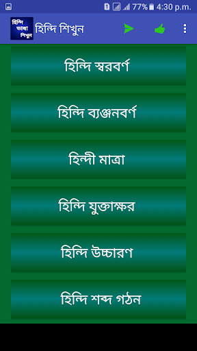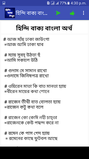 Hindi ay isang makabuluhang wika ng East-Middle-Century of India. Sa kasalukuyan Hindi ay ang estado ng India. Karamihan sa mga tao ng Delhi, Uttar Pradesh, Uttarakhand, Chhattisgarh, Himachal Pradesh, Chandigarh, Bihar, Jharkhand, Madhya Pradesh, Haryana at Rajasthan ay nagsasalita ng wikang ito. Bukod sa ito, ginagamit din ang wikang ito sa wika ng estado sa ibang mga lalawigan ng India. Marami sa atin ang kailangang maglakbay sa iba't ibang bansa sa iba't ibang bansa pagkatapos na malaman natin ang iba't ibang mga wika. At kung ang wika ng mga bansang ito ay hindi maaaring gawin sa iba't ibang uri ng pagkakumplikado. At kaya ang wika ng wika ng iba pang mga bansa ay isa sa pinakamahalagang wika. Maaari naming malaman ang hindi maliit mula sa aking app para sa mga nais Matuto nang hindi mula sa Bangla..