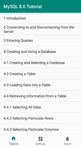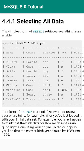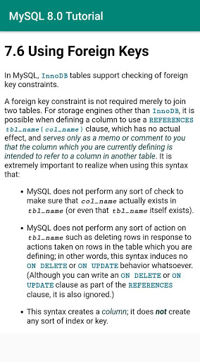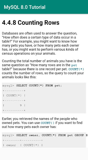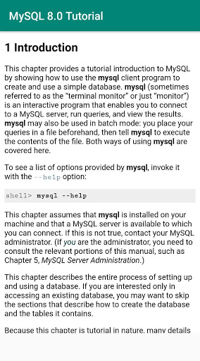 This is a free, offline MySQL 8.0 tutorial app sourced from its official documentation.