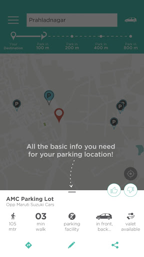 PARKIN let's Amdavadis search for information about parking spots near their destination. Enter the destination to find nearby public and private parking areas for two and four wheelers. Also, find rickshaw stands that are close to your destination. Access data of