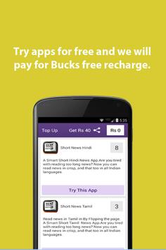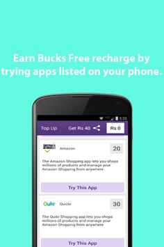 Anytime Anywhere. Just try free apps and earn unlimited money. You can also earn money by Referring to your Friends. Rs.20 for Each Friend. Recharge your mobile instantly. Bucks Free Recharge supports All Operators through out India.