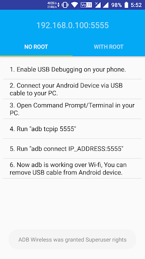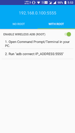 ADB Wireless app allows wireless debugging over WiFi. This app works with or without Root.