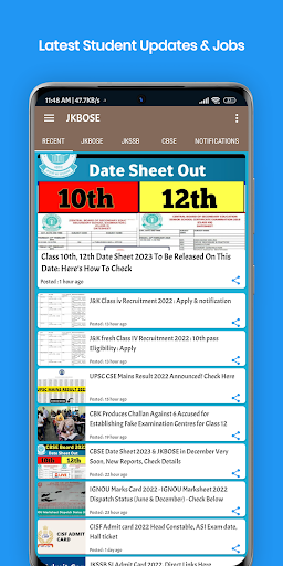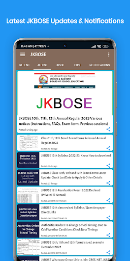 Welcome to JKBOSE an app having Information like latest student updates, government and private jobs, JKBOSE, CBSE, JKSSB, NEET, Kashmir University results, notifications, results, datesheets, and upto the minute news updates from Jammu and Kashmir.
