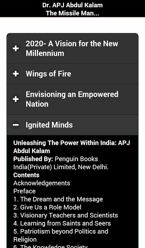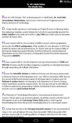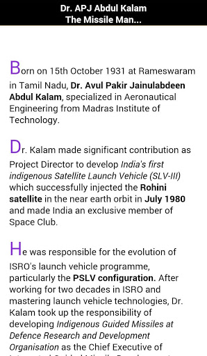 The app provides you all the information about his journey of life and work. Although, he belonged to lower middle class family but despite of that he became the well-known scientist of India and provided first missile to the nation. Dr. Kalam made significant contribution as Project Director to develop India's first indigenous Satellite Launch Vehicle (SLV-III) which successfully injected the Rohini satellite in the near earth orbit in July 1980 and made India an exclusive member of Space Club.
