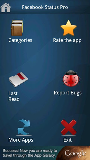 Largest categorized collection of facebook status updates . Select from more than 1000 status quotes and update it as your facebook status or send as sms or tweet it easily . No need to search websites for a cool status quote , now you can choose one from our huge collection of 1000s of status quotes and update share with just one tap . The quotes in this app has been categorized into : funny , Friendship , love , inspirational , moving on and heart breakfor easier usage .AD FREE VERSION AVAILABLE ONLY ON AMAZOM APP STORE If you do not need categorized quotes , please download the lite version of facebook status from android market .Categories : Love Status QuotesAbout MeStatus QuotesAwkward Status QuotesInspirational Status QuotesHeart BreakStatus QuotesFunnyStatus QuotesFriendshipStatus QuotesBeing Real Status QuotesMoving On Status QuotesTruthStatus QuotesHope Status QuotesCelebrity Status QuotesFlirtyStatus QuotesEmo Status QuotesGoodBye Status QuotesKissing QuotesChange QuotesCan be installed moved to SD cardCategorizedWeekly updatesCopy the quotes with a tapShare the quote via facebook , twitter , gmail , sms etcShuffle quotesButtons to go to end and beginningRate the app buttonThis app will remember that last quote you read and will take you where exactly you were even if you exit the app . You do not need to start again from the beginning .Whats inside the box? quot;I39;m fluent in three languages: English, Sarcasm, and Profanity.quot;quot;Pain makes you stronger. Fear makes you braver. Heartbreak makes you wiser.quot;quot;I have to take my paycheck to the bank. Its too little to go by itself.quot;quot;Married men live longer than single men, but theyre a lot more willing to die.quot;quot;I asked God for a bike, but I know God doesnt work that way. So I stole a bike and asked for forgiveness.quot;.......If you have any suggestion or complaints please mail us at : dziner00@gmail.com .If you have any problem using this app , please let us know before you make a negative comment .The app is FREE and Adsupported, we will never show notification ads . There will be an inapp banner ad .tags : facebook status quotes , facebook status messages , funny status , funny status quotes , love quotes for facebook , facebook status updates , funny jokes , flirty facebook status quotes , truth quotes , celebrity facebook status quotes , hope status quotes , hope statuses , good bye quotes , good bye facebook statuses , emo facebook status quotes