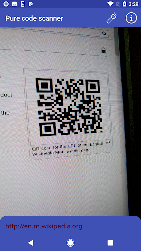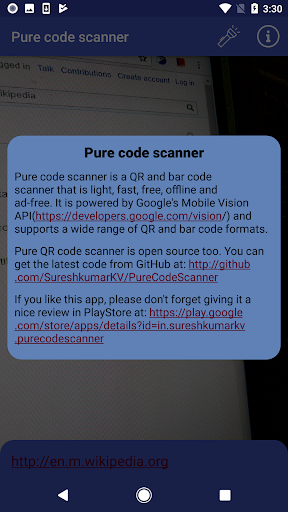 Pure code scanner is a QR and bar code scanner that is light, fast, free, offline and ad-free. It is powered by Google's Mobile Vision API(https://developers.google.com/vision/) and supports a wide range of QR and bar code formats.