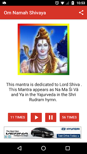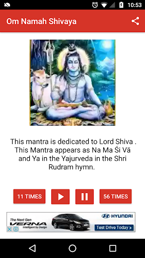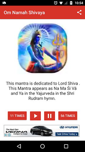You can listen to Om Namah Shivaya Mantra or Shiva Mantra 11 times, 56 times or 108 times in this free app.