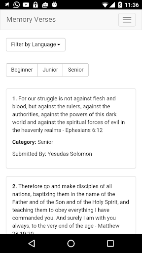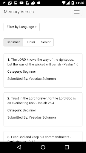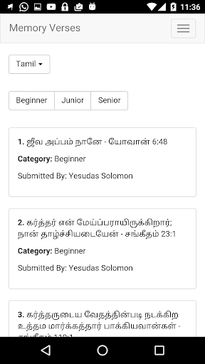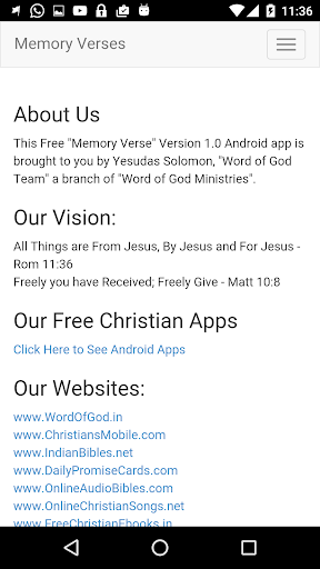 This Free "Memory Verses" Version 1.0 Android app is brought to you by Yesudas Solomon, "Word of God Team" a branch of "Word of God Ministries".