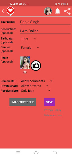 Well, when you first open the app, you can either log in with your Girls Live Video Talk account or complete a profile form to let others know a little bit more about you. The items in the profile are: Name, nickname, optional description about yourself, birthday, gender, and photo. You can also specify whether receiving comments or private messages are allowed or not OR Also You Can Log In with Google.