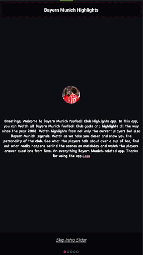 Greetings, Welcome to Bayern Munich Football Club Highlights app. In this app, you can Watch all Bayern Munich Football Club goals and highlights all the way since the year 2010. Watch highlights from not only the current players but also Bayern Munich legends. Watch as we take you closer and show you the personality of the club. See what the players talk about over a cup of tea, find out what really happens behind the scenes on matchday and watch the players answer questions from fans. An everything Bayern Munich-related app.