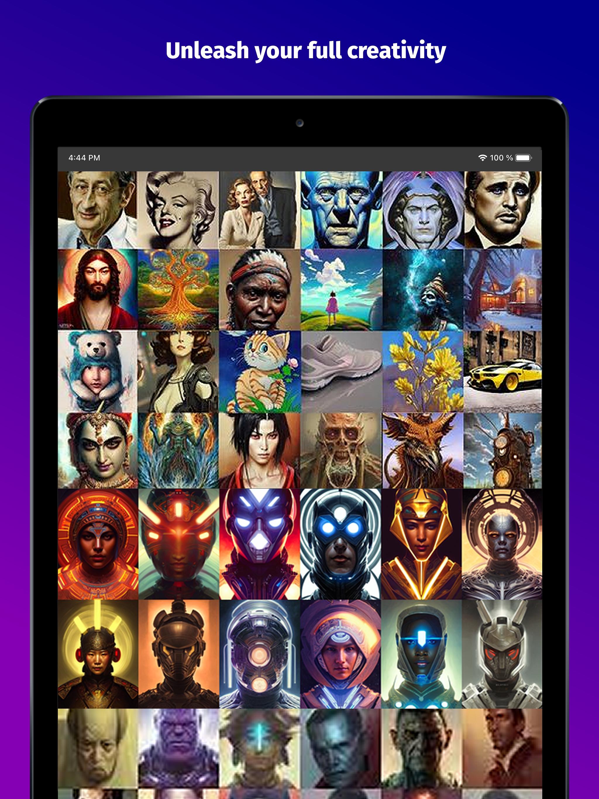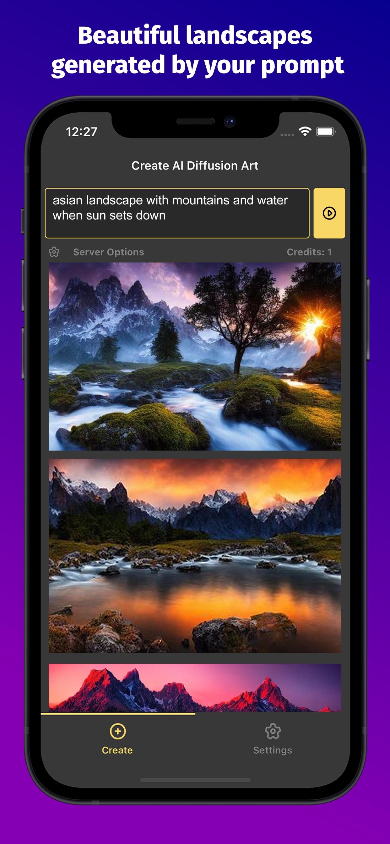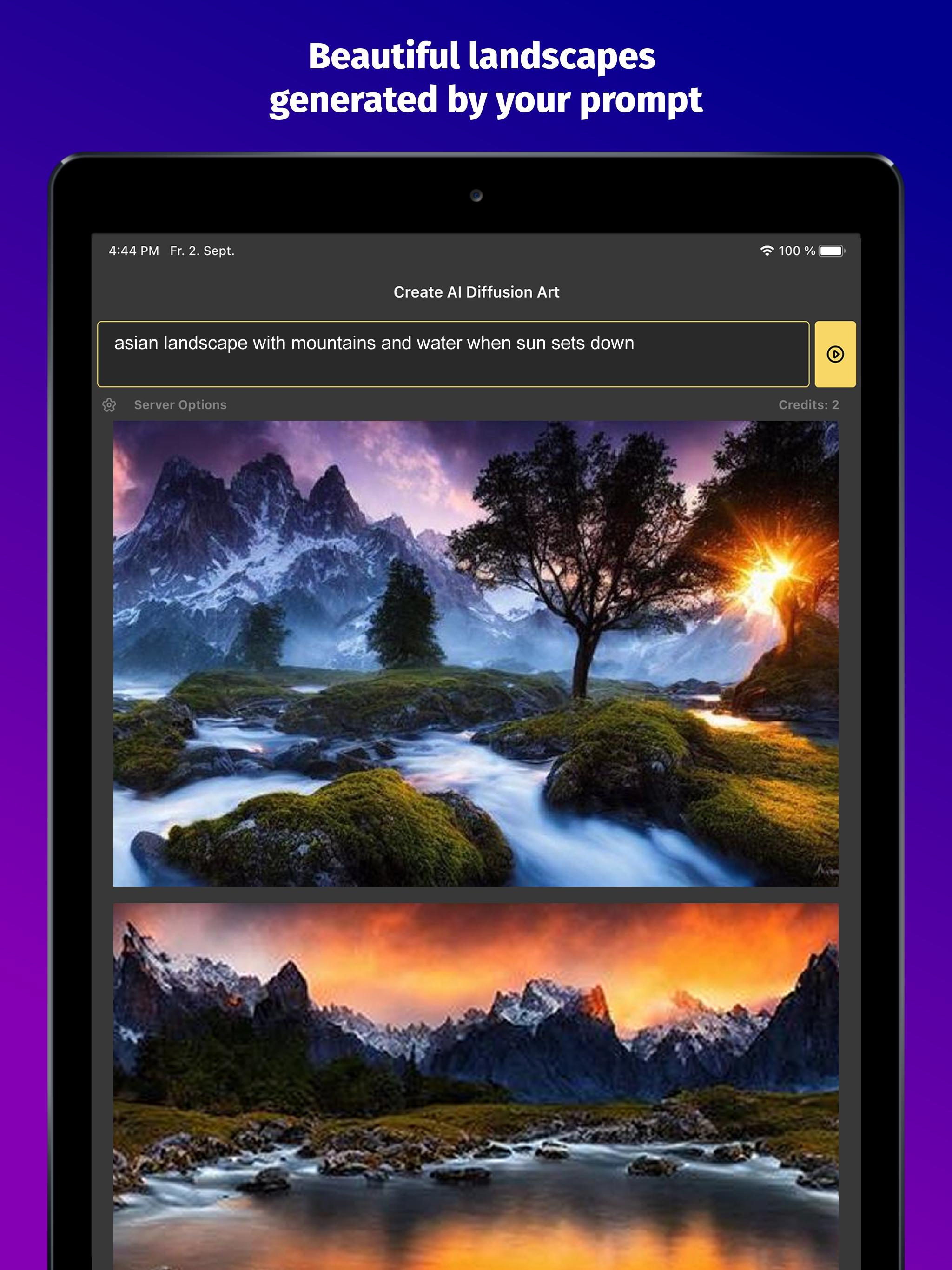 Simply describe your topic as a text prompt, such as "asian landscape with mountains and water when sun sets down" or "groot tree portrait in van gogh style" and let the AI generate matching images.
