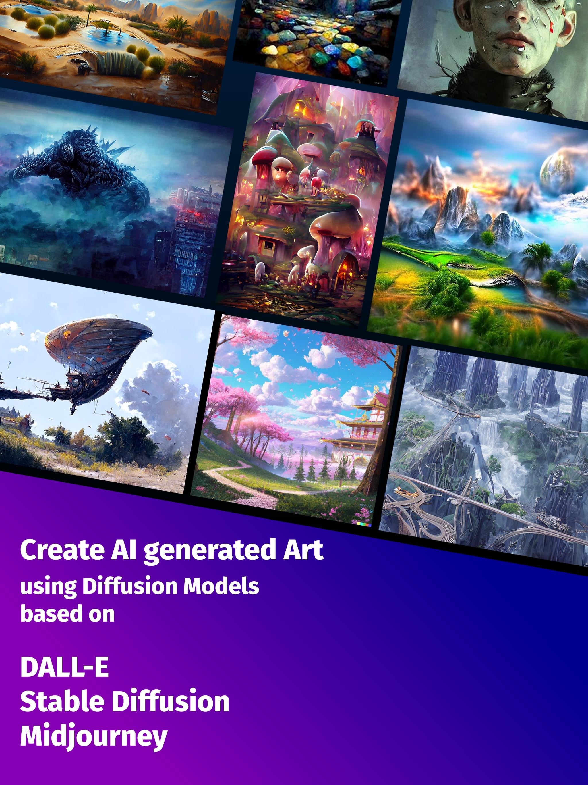 Create free AI generated art using the power of newest diffusion AI models using technologies such as DALL-E, Stable Diffusion, and Midjourney
