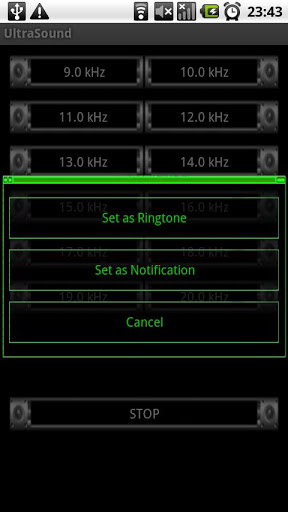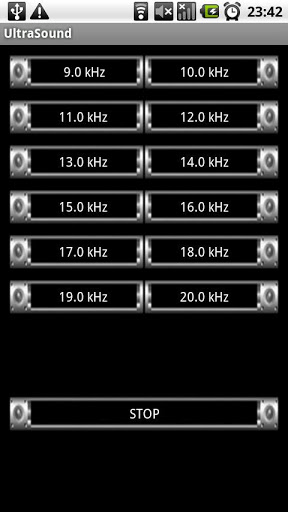 Can you hear the sound? check your earage now aka Mosquito sound.Ultra soundMosquito sound.Most adults can39;t hear the sound.But it39;s so annoying for most young people, animal insect.Its depending on your earsight.Long click to set them as ringtone or notification.Check your earage nowTODO:1.Set beep duration.2.widget any other request?You can put it to sdcard if android 2.2, 2.3, 3.0, 3.1, 3.2, 4.0
