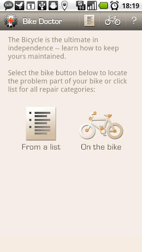 Bike Doctor helps you to keep your bicycle in perfect condition. It is like having a little bike mechanic in your pocket ready to spring to action whenever your bike needs a repair!