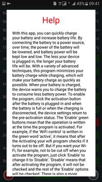 With this app, you can quickly charge your battery and increase battery life. By connecting the battery to a power source, over time, the power of the battery will be lowered, and battery power will be kept low and low. The less your device is plugged in, the longer your battery life will be. With a variety of advanced techniques, this program minimizes your battery charge while charging, which will make your battery charge as quickly as possible. When your battery is charged, the device warns you to charge the battery to consume less battery power. To enable the program, click the activation button after the battery is plugged in and when the battery is full or when the charging is disconnected, the device settings return to the pre-activation status. The 'Enable' green buttons mean that the operation is written at the time the program is activated. For example, if the 'WiFi control' is written in the green word 'active', it means that after the Activating your wifi program checks if it turns out to be off. But if you want your Wi-Fi, for example, not to be cut off when you activate the program, just click 'Enable' to change it to 'Disable'. 'Disable' means that after activating the program, it will not be checked and the rest of the 'Enable' options will be checked. There is also a more advanced setting for the 'Battery Charged Warning'. Next to the active button, this is a black button. By pressing this button, you can make alert settings. By default, the alarm sounds when the battery is full 3 times. You can change this number in this section and even choose a mode that will broadcast the alarm sound when charging the charger. Ensure your device's battery life with this app.