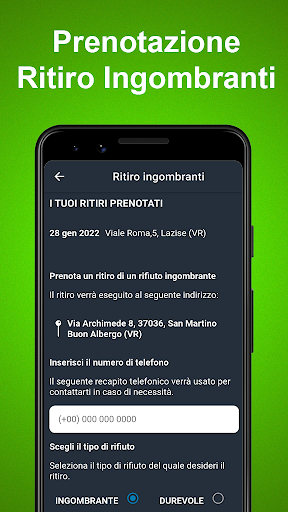 Prenotazione ritiro ingombranti: è possibile prenotare direttamente all'interno dell’app il ritiro del proprio rifiuto ingombrante o durevole, semplicemente compilando il form con i propri dati e la data più opportuna.