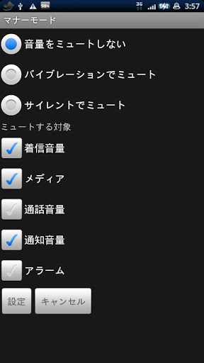 マナーモード設定アプリです。 音量キーを誤って押してしまい、呼び出し音や音楽が鳴ってしまうのを防ぎます。 ウィジェットとしてホーム画面に設定すると、クリックひとつでバイブレーションモード・サイレントモードの設定、解除が可能になります。 ミュートする対象を設定できるので、サイレントモードでもアラームだけは鳴らす、ということも可能です。