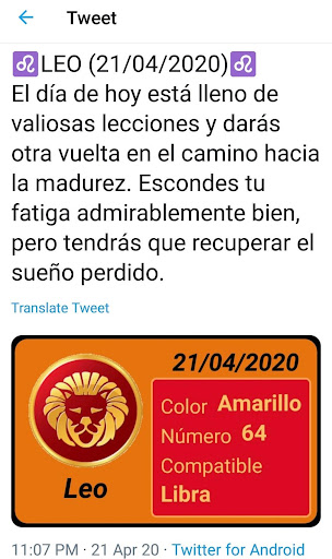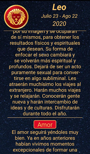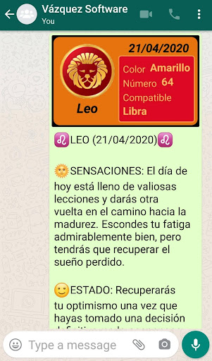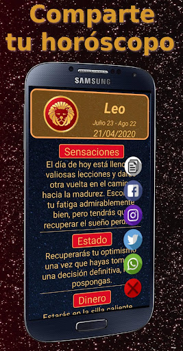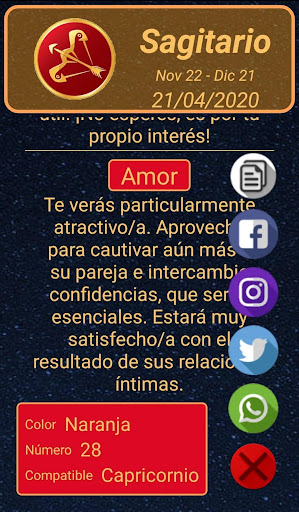 Sadece İspanyolca.Bütün yıl ve her gün için burçlarınızı tanıyın.Günün uyumlu işaretine ek olarak, sağlığınızla, iş, para ve sayı ve şimdiki gün için şansın rengi ile nasıl aşık olacağı konusunda sizi günlük olarak bilgilendirecektir.Ayrıca WhatsApp, Twitter ve diğer sosyal ağlarla günlük burçları tek bir tıklamayla kolayca paylaşabilirsiniz.Size bir bildirim göndermek için günlük bir bildirim yapılandırmanıza ve burcunuza danışmayı unutmayın.Herhangi bir çiftin sevgisinde geleceği keşfedin.