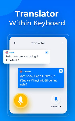 keyboard apps for android convert English into Roman Amharic, text to speech all Amharic language words with kannada keyboard. The user can text to speech engin Language with voice generator and get output in Amharic typing with keyboard voice typing keyboard. If the user wants to type to talk in Amarone. In this multiple language voice typing keyboard, you have a chance to use a voice player speak Arabic and translates in Amharic typing with voice. geez keyboard can easily copy the English to Amharic languages using this Amharic speak-to-text keyboard.