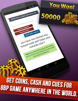 you can see all available rewards on application and can apply each code individually . This application for 8 ball pool tool will apply all available rewards directly on your 8 ball pool billiards account with your unique id.what do you waiting for download 8 ball pool new games in 2017 and earn coins , keep challenge with friends