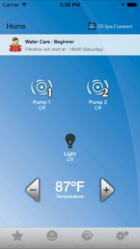 Using a wireless or cellular Internet connection, the D1 Spa Connect app provides a user-friendly interface that allows you to control your hot tub functions from outside of your spa, such as: