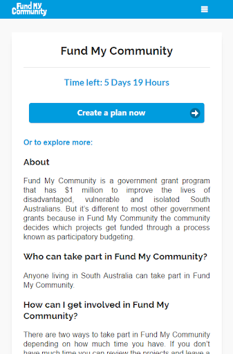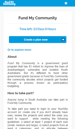 Fund My Community is a government grant program that has $1 million to improve the lives of disadvantaged, vulnerable and isolated South Australians. But it’s different to most other government grants because in Fund My Community the community decides which projects get funded through a process known as participatory budgeting. This application allows users to participate the event by creating and submitting their Plan on their mobile devices.