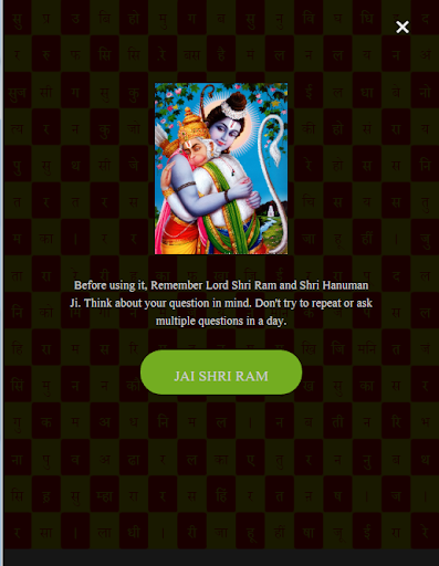 First remember Lord Shri Rama in your mind and pray him to give answer ( don't disclose the Question to anyone before asking to Shri Rama ). All you have to do is just click on any of the letters in the boxes with CLOSED eyes. For the best answer of your question you should have only closed ended question in your mind.