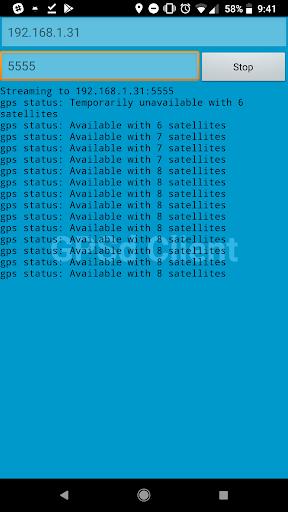 This application forwards NMEA data from your phone's GPS to a specified host. It's goal is to easily plug and feed data into a GPS server service (e.g. GPSd), using your cellphone as a GPS device. This way, your cellphone can be used as a GPS in navigation or robotics applications running in a host computer.
