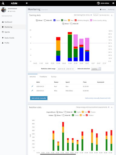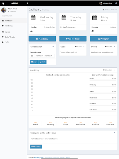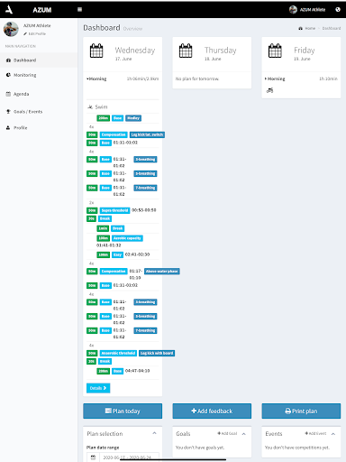 AZUM system offers you a wide range of free training plans (https://azum.ch/en/plans/). From preparation for the first 5 km run, through athletic, cycling and swimming programs, to complex form building for a long distance triathlon - AZUM system helps athletes of all