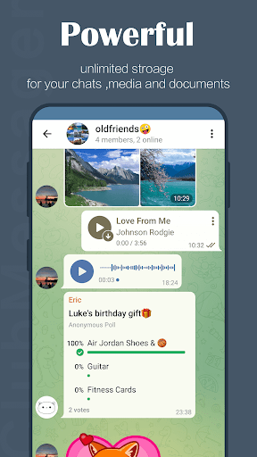 4. UNLIMITED capacity storage: You can send media and files without any restrictions on their type and size. Your entire chat history will not require disk space on your device and will be stored securely in the Telegram cloud when needed.