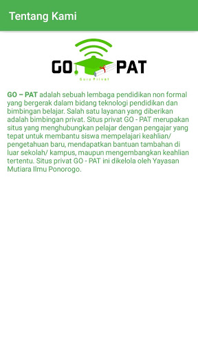 GO – PAT adalah sebuah lembaga pendidikan non formal yang bergerak dalam bidang teknologi pendidikan dan bimbingan belajar. Salah satu layanan yang diberikan adalah bimbingan privat. Situs privat.GO - PAT merupakan situs yang menghubungkan pelajar dengan pengajar yang tepat untuk membantu siswa mempelajari keahlian/ pengetahuan baru, mendapatkan bantuan tambahan di luar sekolah/ kampus, maupun mengembangkan keahlian tertentu. Situs privat.GO - PAT ini dikelola oleh Yayasan Mutiara Ilmu Ponorogo.