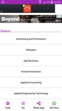 Advertising and Promotions, Afrikaans, Agri-Business, Animal Production, Applied Accounting, Applied Engineering Technology, Automotive Repair and Maintenance, Business Practice, Carpentry and Roof Work, Client Service and Human Relations, Computer Hardware and Software, Computer Programming, Construction Planning, Consumer Behavior, Contact Center Operations, Data Communication and Networking, Economic Environment, Electrical Principles and Practice, Electrical System and Construction, Electrical Workmanship, Electronic Control and Digital Electronics, Electronics, Engineering Fabrication, Engineering Fundamentals, Engineering Graphics and Design, Engineering Practice & Maintenance, Engineering Processes, Engineering Systems, Engineering Technology, English, Entrepreneurship, Farm Planning and Mechanisation, Financial Management, Fitting and Turning, Food Preparation, Hospitality Generics, Hospitality Services, Introduction to Information Systems, Introduction to Systems Development, Life Orientation, Management Practice, Marketing, Marketing Communications, Masonry, Materials Technology, Mathematics, Mathematics Literacy, New Venture Creation, Office Data Processing, Office Practice, Operations Management, Physical Sciences, Plant and Equipment, Plant Production, Plumbing, Principles of Computer Programming, Professional Engineering Practice, Project Management, Soil Sicence, Systems Analysis and Design, Tourism, Welding, Workshop Practice