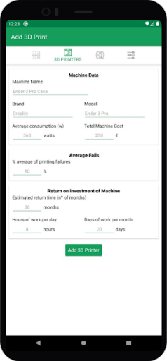 - Saves all data from the 3D Printer and the Filament, having the possibility to add more than one printer and more than one filament in the same application