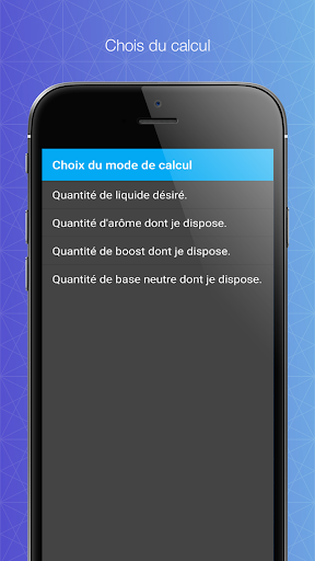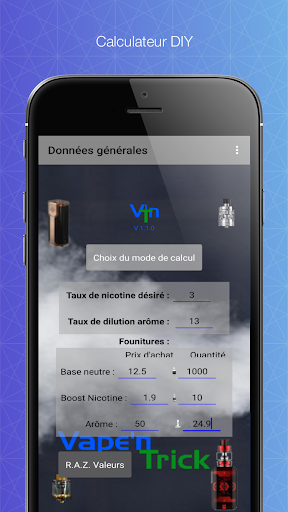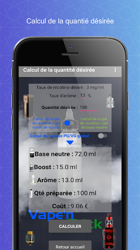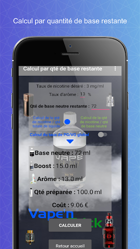 - Calcul d'une quantité de liquide en fonction de la quantité de boosters qu'il vous reste.