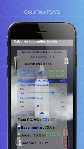 - Calcul en direct du taux de PG/VG du mélange si vous avez des taux de PG/VG différents entre la base et les boosters.