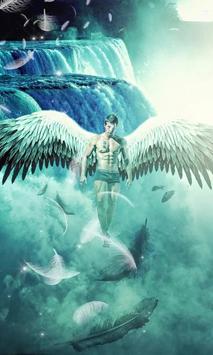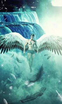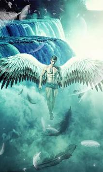 Fantasy live wallpaper presenting a male angel who floats above the water, near a high waterfall. The angel seems to be calm and strong. His wings are wide, mostly consisting of white feathers. He has a tattoo on his chest similar to Chinese symbols. Animated water and feathers all around make this wallpaper unique. Get it now for your Android phone!