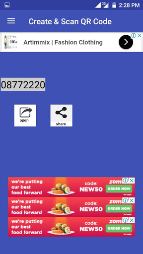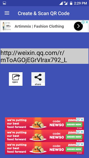 when you will click on scan button ,and scan your QR code then you will find your scanning result,there you can find an open button and share button .