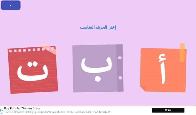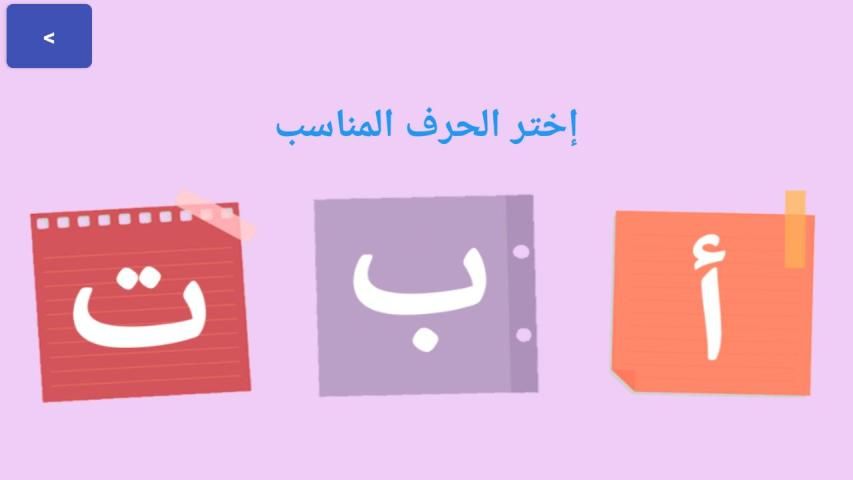 لعبة الحروف : لعبة شيقة حيث يستمع الطفل الى لفظ احد الحروف بصورة عشوائية وتظهر امامه ثلاث خيارات ليختار منها وبعد ان يختار الحرف الصحيح ينتقل الى الحرف الذي بعده وهكذا