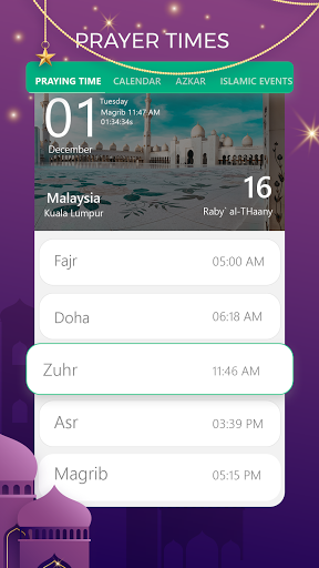 - View the remaining time for each prayer and see the prayer timings for the entire day.