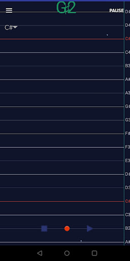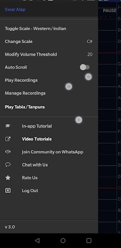 The performer can set his own scale - or the tonic note. The vertical(Y axis) scale turns into the hindustani SARGAM when tapped in the extreme right side of the screen. The tonic note is depicted in a red colour.