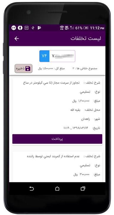 جزییات هر خلافی ازجمله تاریخ تخلف، محل جریمه، نوع تخلف رانندگی و مبلغ جریمه نمایش داده میشود.
