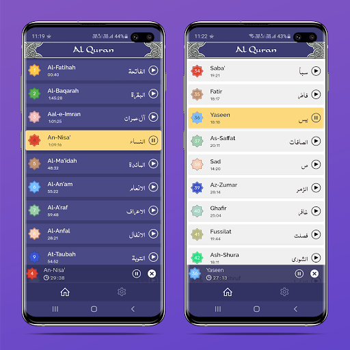 Every Surah will be played back to back automatically. Don't need to tab again and again on every Surah.