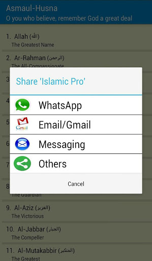 • 99 names of Allah and Share selected name to your friends on Whatsapp, on Email, on Message and on other social networks