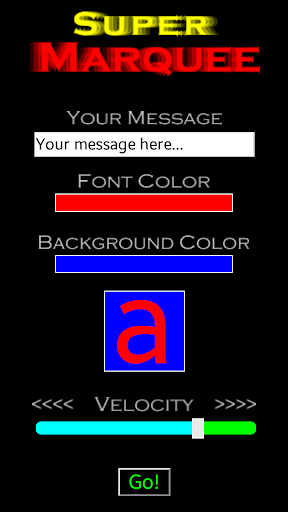 Show your message to the world! Super Marquee is your personal animated banner for every occasion! Write your message, select the font and the background colors, the speed of the text and show it to everyone!