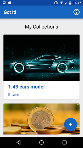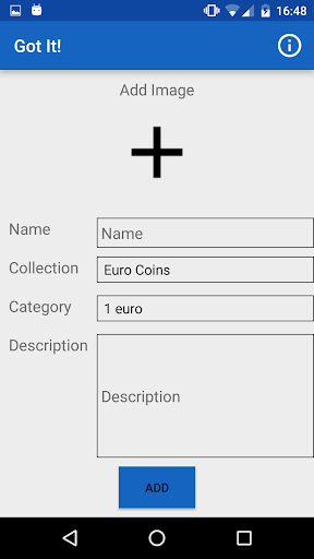 You can create a collection, sub-categories and add objects. For each item, category and collection you can add photos from your gallery or camera.