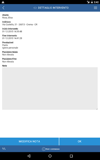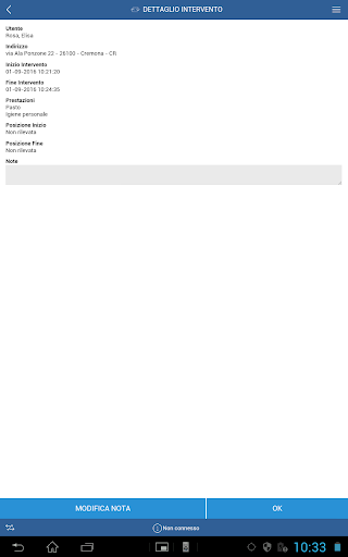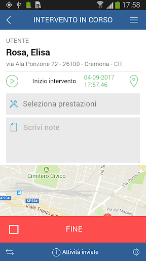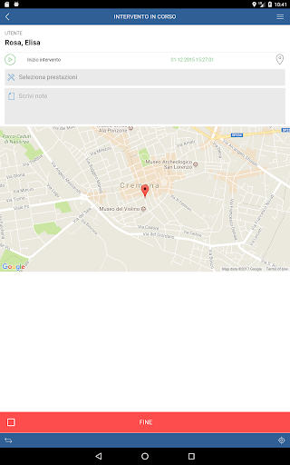 L'app permette la registrazione (geo-referenziata) della data e dell'ora di inizio/fine operazioni di attività svolte dal personale sul territorio; raccoglie anche informazioni sul tipo di servizio erogato e le trasmette in tempo reale al gestore del sistema. Permette la rendicontazione anche di trasferte e pause pranzo. Una semplice e completa interfaccia web consente la gestione di tutte le anagrafiche, dei servizi erogati e fornisce una set completo di report.