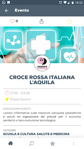 * Gestione Personalizzata degli Eventi: l’applicazione informa i partecipanti circa gli tutti gli eventi di UnivAq Street Science e SHARPER. E’ possibile creare una lista di preferiti, sapere quali siano gli eventi in corso, effettuare delle ricerche puntuali in base a luogo, orario, categorie, e nome dell’evento.